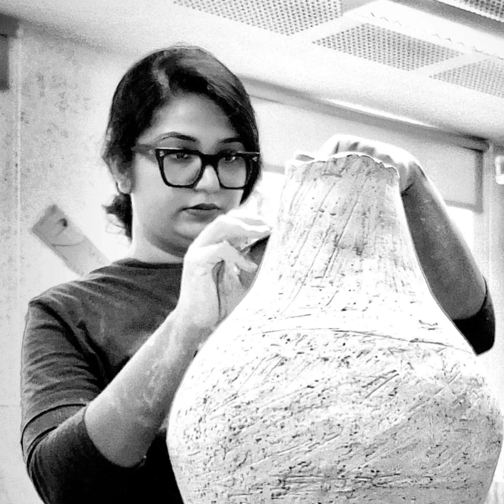 Every piece in her practice is inspired by Ikat textiles, which she translates into black and white clay through a careful, hands-on process. Using repetition, cutting, and recompression, she creates forms where the pattern runs through the body of the work.