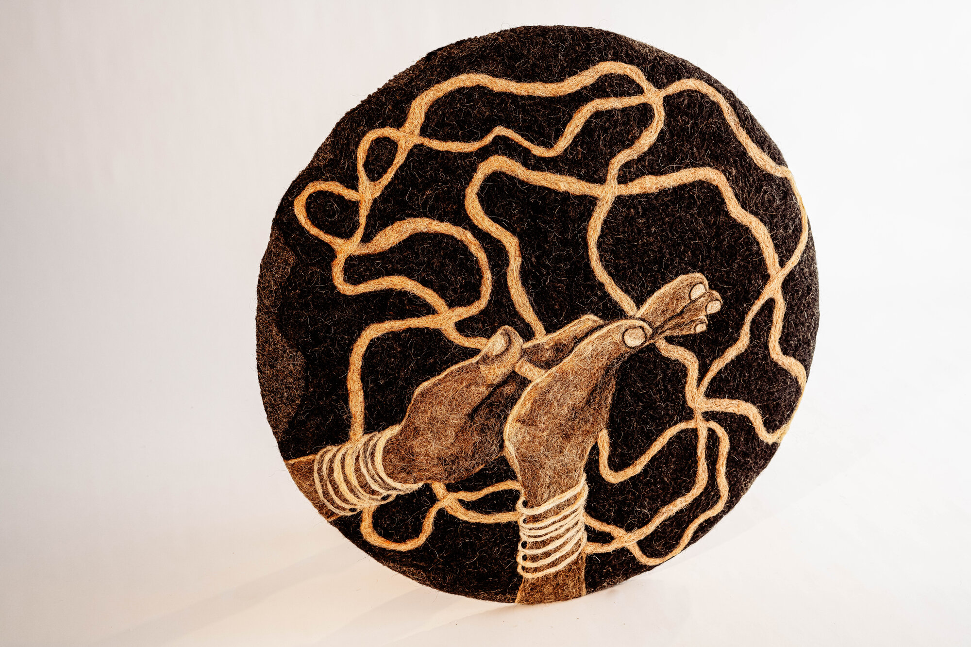 The bangled wrists suggest everyday workers and caregivers, whose gestures rarely enter gallery spaces but silently hold up entire worlds. This piece is a contemporary offering to slowness and tactility, a reminder that making is also a form of listening. It asks the viewer to pause, trace the lines with their eyes, and imagine the stories carried in each curve of fibre. In doing so, it invites a renewed respect for the hands, materials, and tangled journeys that sit behind the objects we so easily take for granted.