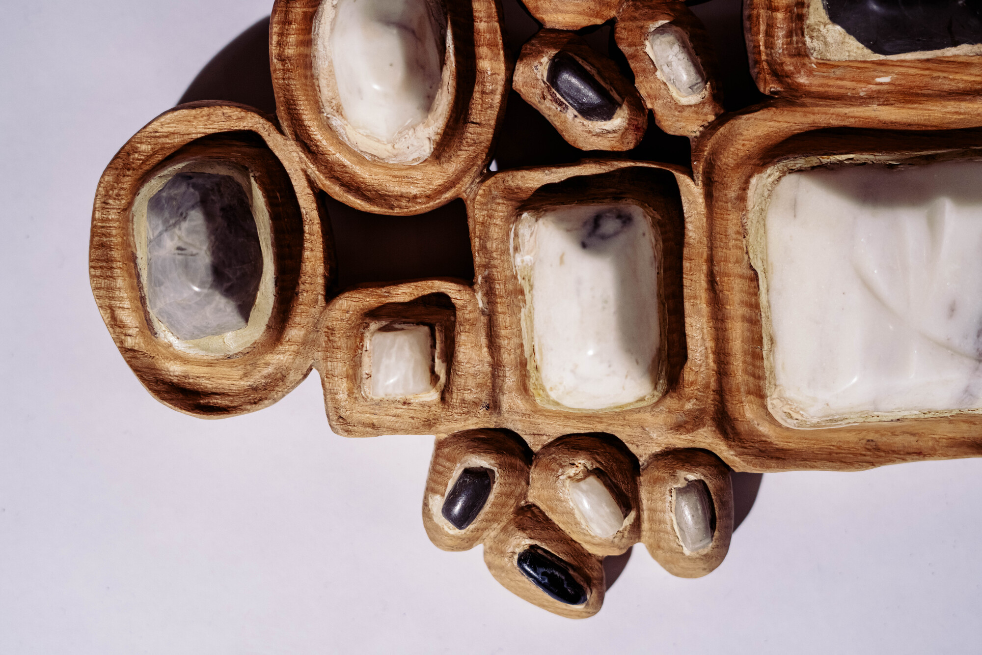Pieces may include solid wood, different metals, brass, semi-precious stones, lucite, and at times textiles, selected for their texture, weight, contrast, and visual depth. Sustainability is approached through intentional making, handcrafted production, low-waste sampling, and a focus on creating one of a kind pieces rather than mass repetition.