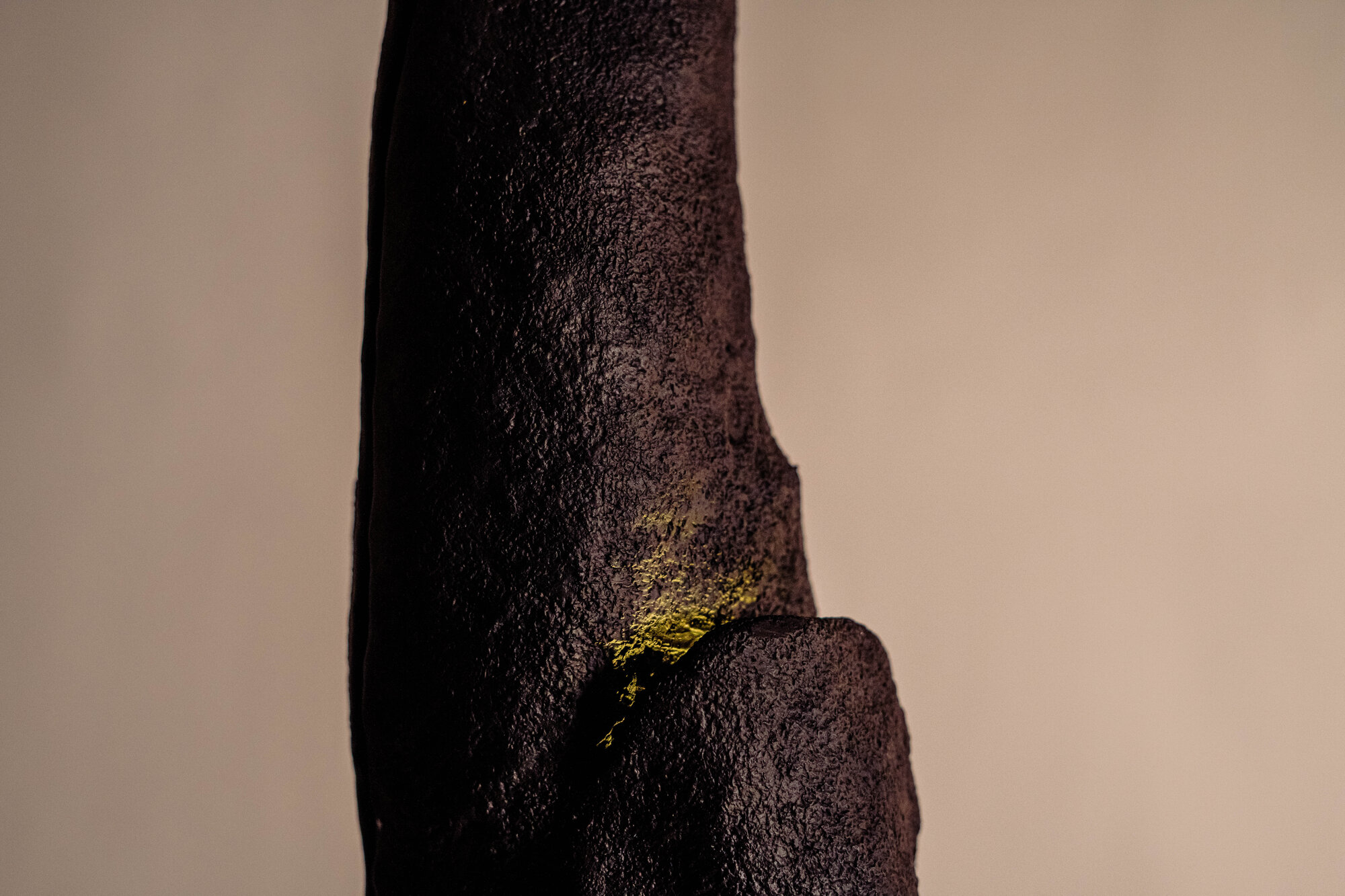 The surface carries earthen textures, recalling soil touched by breath and movement.