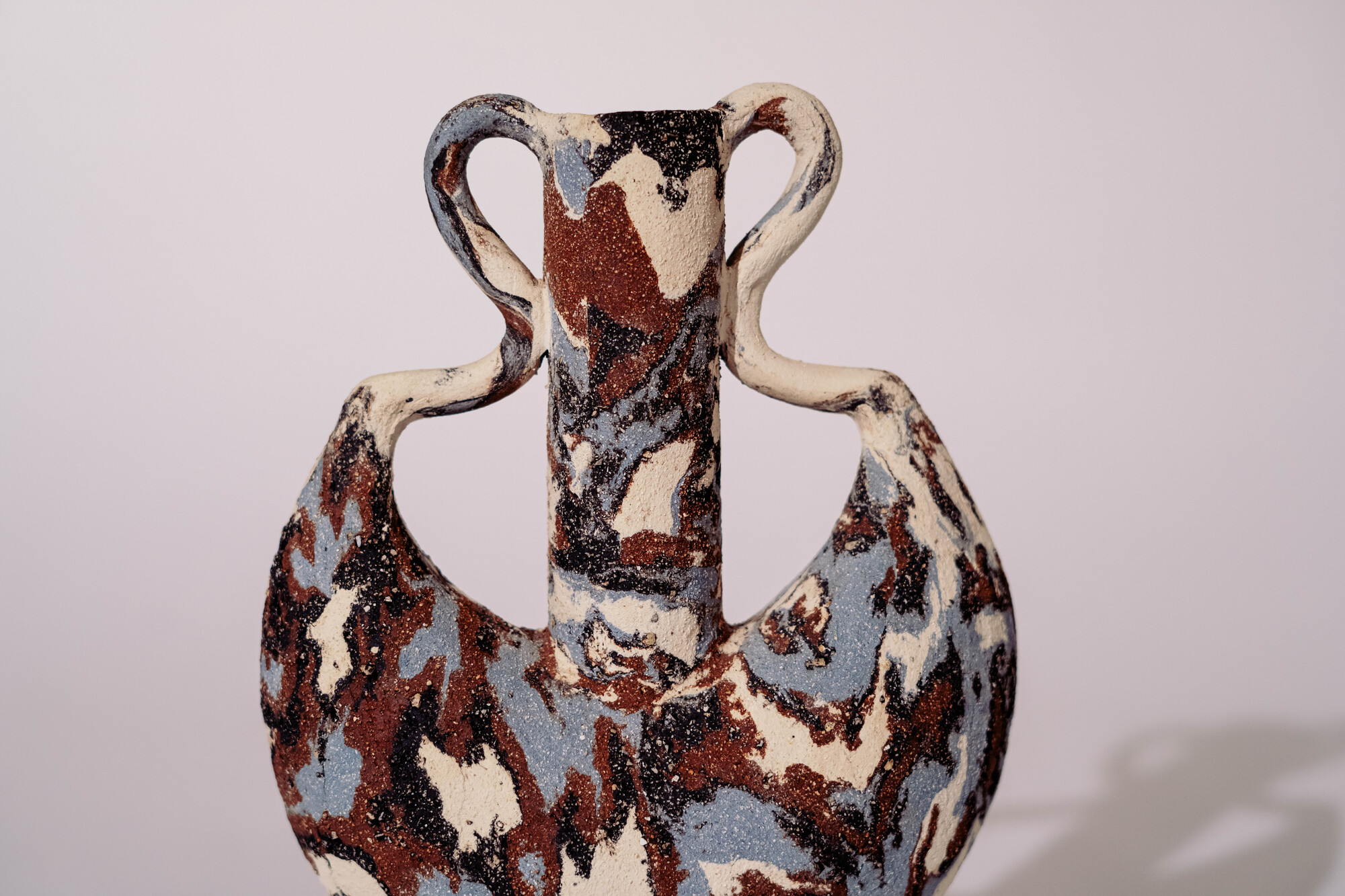 Three clays are intertwined, cut, and rolled using the nerikomi technique. Closely resembling the ancient process of making Damascus steel, this method gives the piece its striking visual effect. The surface is then painstakingly wiped back to reveal the texture of the grog—fired and crushed clay—embedded within the form.