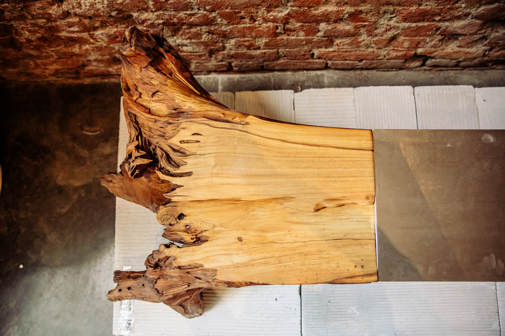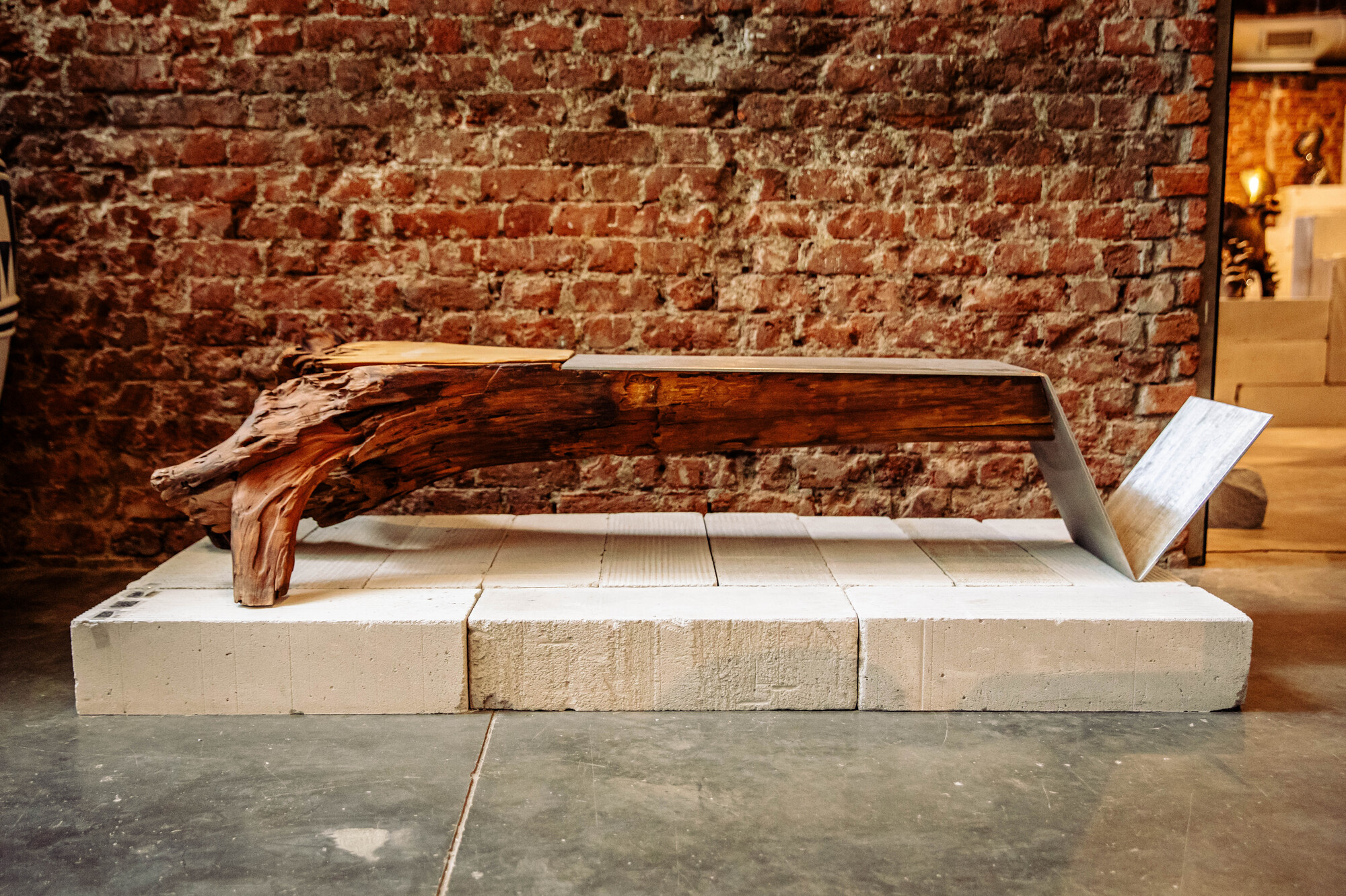 This center table brings together raw nature forms and contemporary design together. In this creation, the rotten reclaimed wooden trunk is carefully divided in half and rested on stainless steel. The sculpture's wood is left undisturbed and supported by a steel element that adds function, contrast, and a refined modern edge. The combination of fluid wood grain and crisp metal detailing creates a functional Art piece that feels both grounded and elevated.