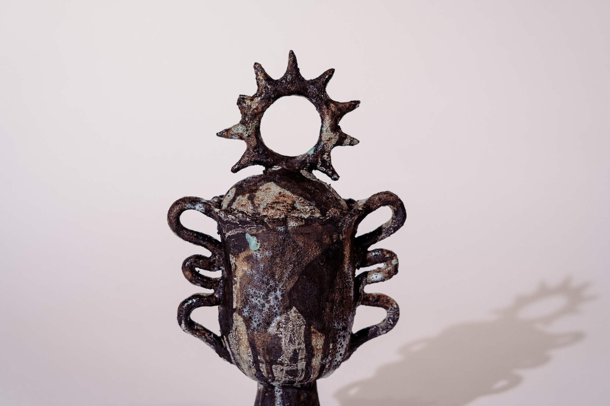 Inspired by ancient forms, this handbuilt piece is decorated through a loose layering of glazes. The maker’s marks of pinching, rolling, and pouring remain visible, becoming an integral part of the final surface and form.