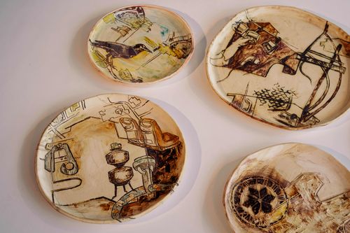 Alongside this, I employ wood-burning techniques to draw directly onto wooden surfaces without the use of ink or paint, allowing heat to permanently inscribe memory into the material. In my ceramic works, I use underglaze on stoneware, preserving imagery through the transformative act of firing. Though distinct in process, these mediums collectively articulate themes of memory, displacement, and belonging.