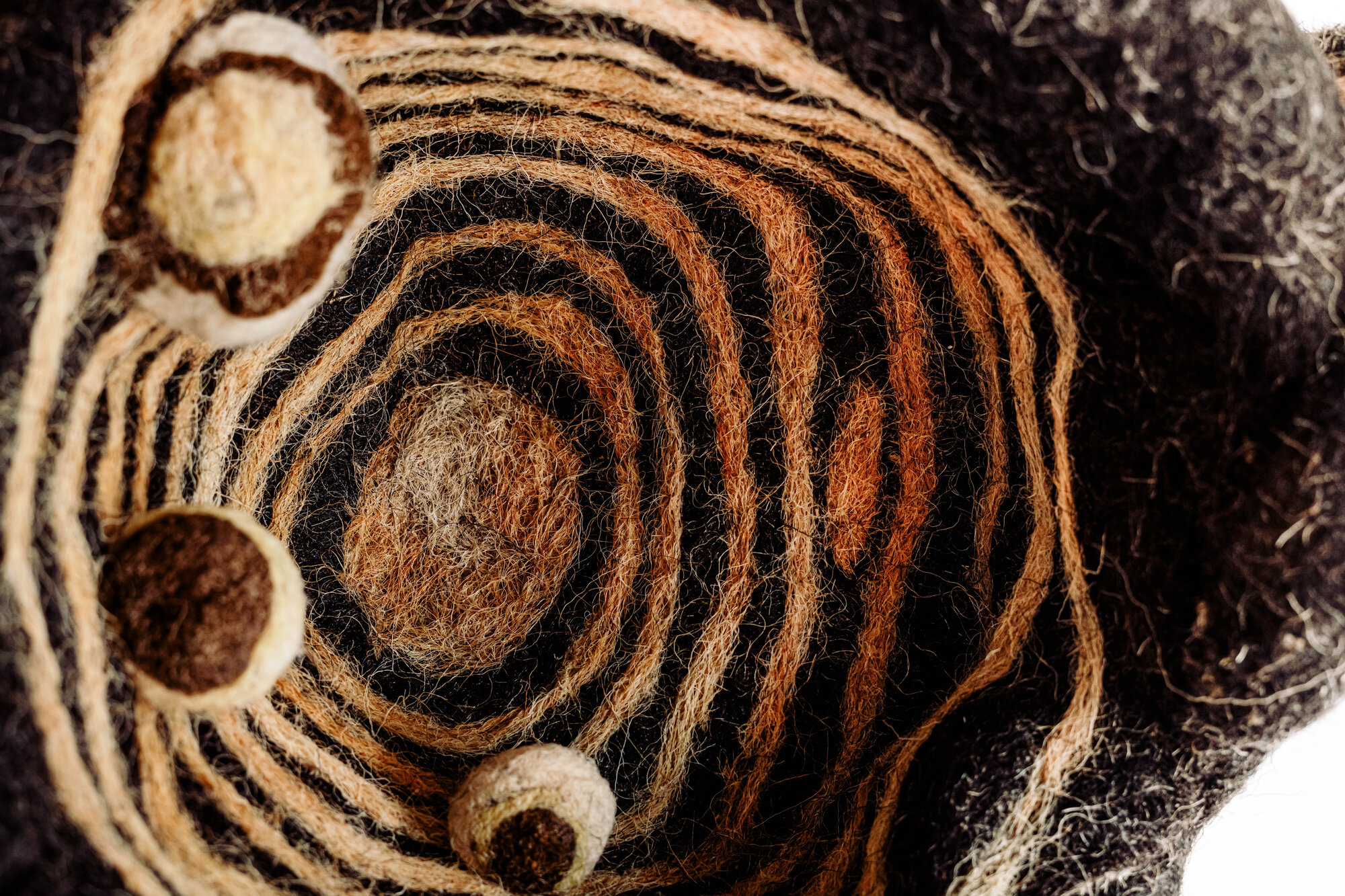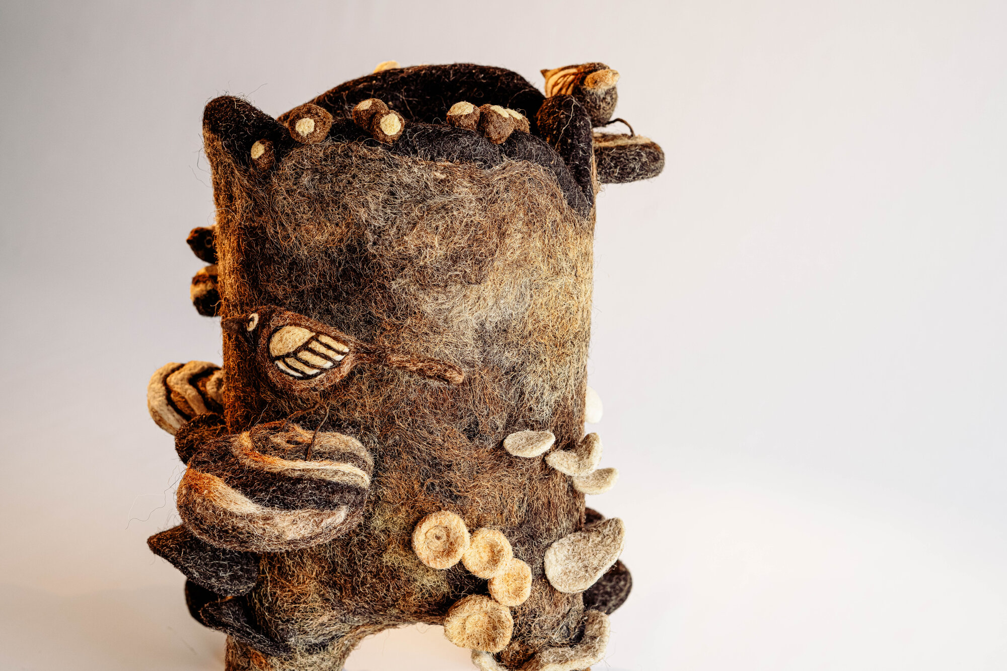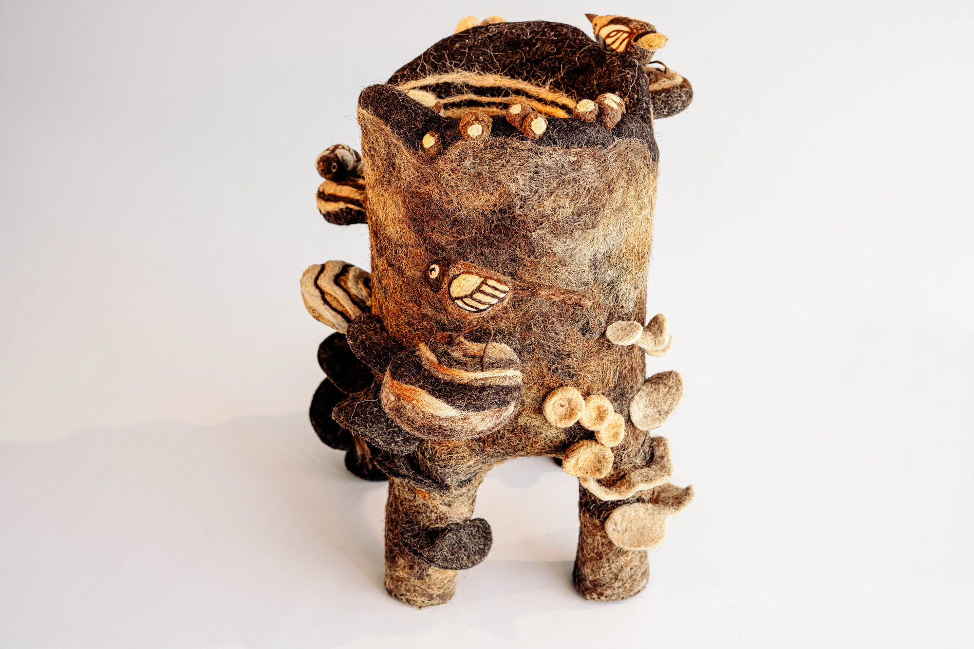 This sculptural work reflects on ecological resilience through the quiet poetry of decay. Formed in wool, the dark, textured core evokes a fallen tree returning to the earth, while the striking fungi forms—striped, pale, and alive—symbolize the mycelial networks that transform death into renewal. By highlighting this often unseen microbial economy, the piece invites viewers to reconsider the boundary between life and loss, offering a contemporary meditation on nature’s ability to regenerate, reorganize, and endure.