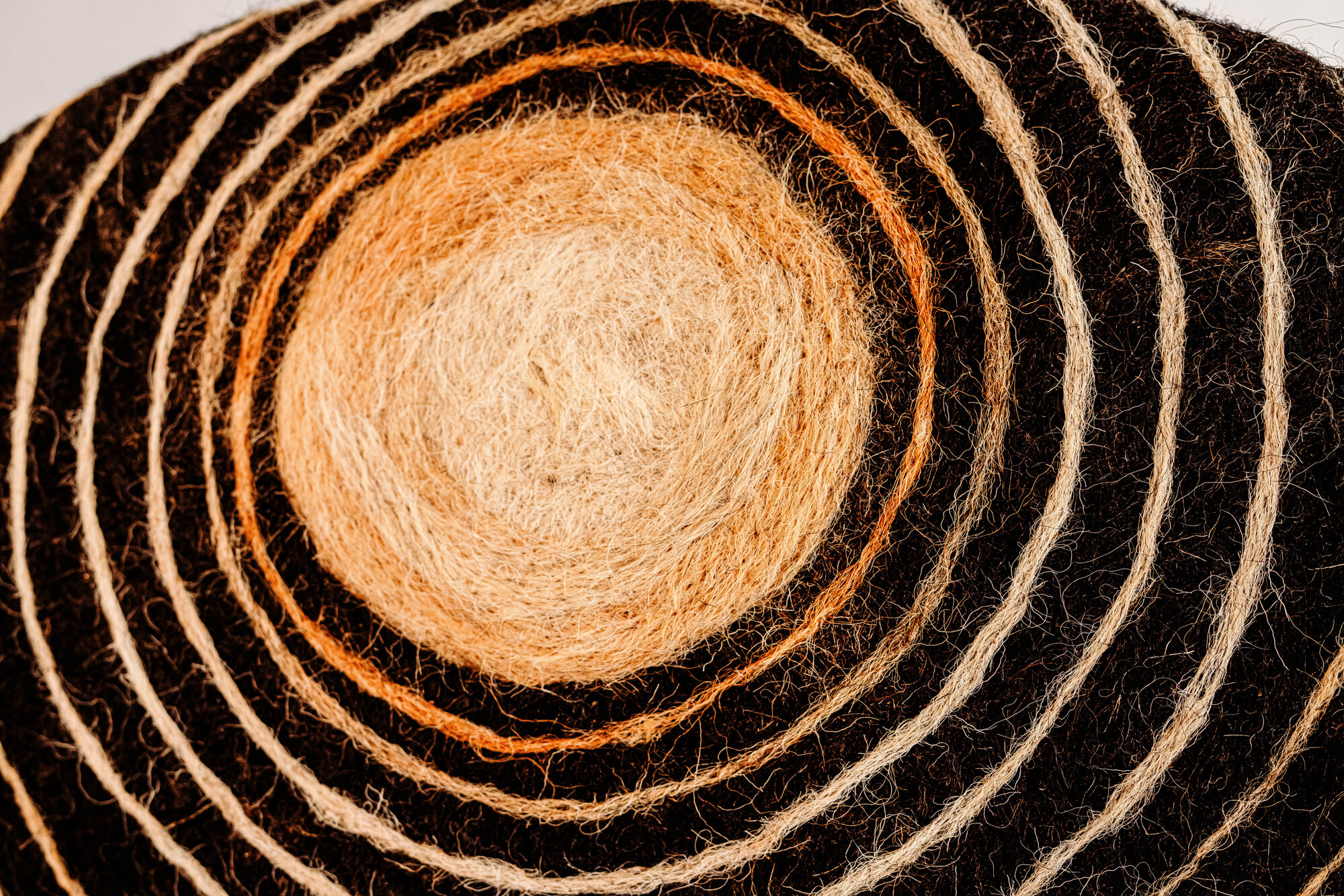 fleeting emotions into tactile forms. My forest-side studio shapes both material and mood; the changing seasons—from harsh summers to the rhythm of monsoons—influence the textures, colours, and narratives I create. A defining aspect of my work is the 52 natural colour palette that emerges organically from the sheep, their wool shifting subtly with grazing seasons, vegetation, and climate.