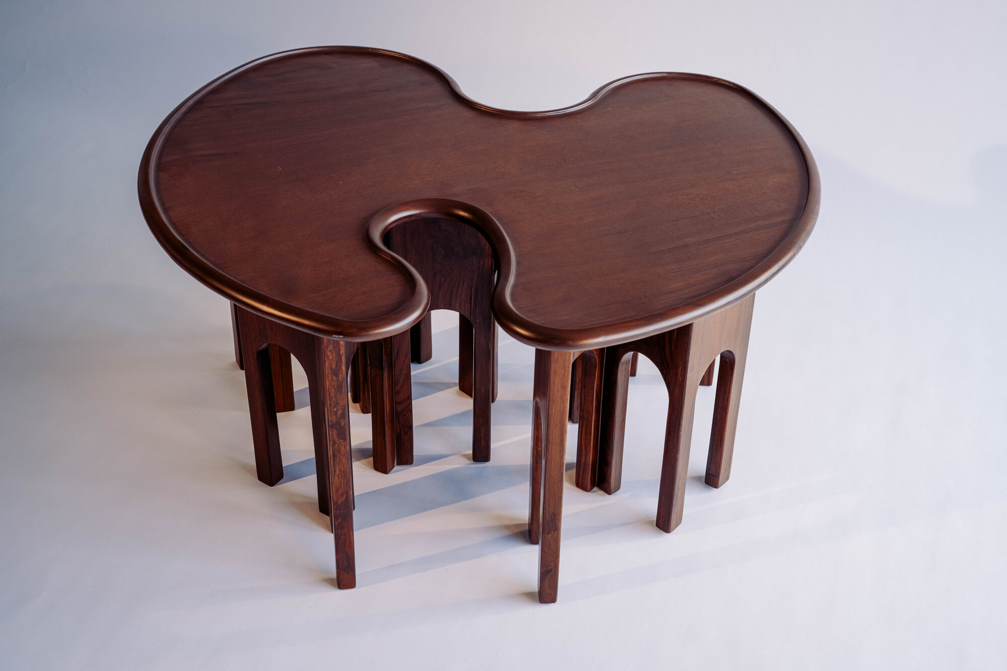 This quiet irregularity speaks to the idea of sonder: the understanding that even when things look similar from afar, each element carries its own orientation, its own story, its own direction. Together, these legs form a connected structure—shared yet individually defined—supporting an organically contoured top that softens the entire composition.