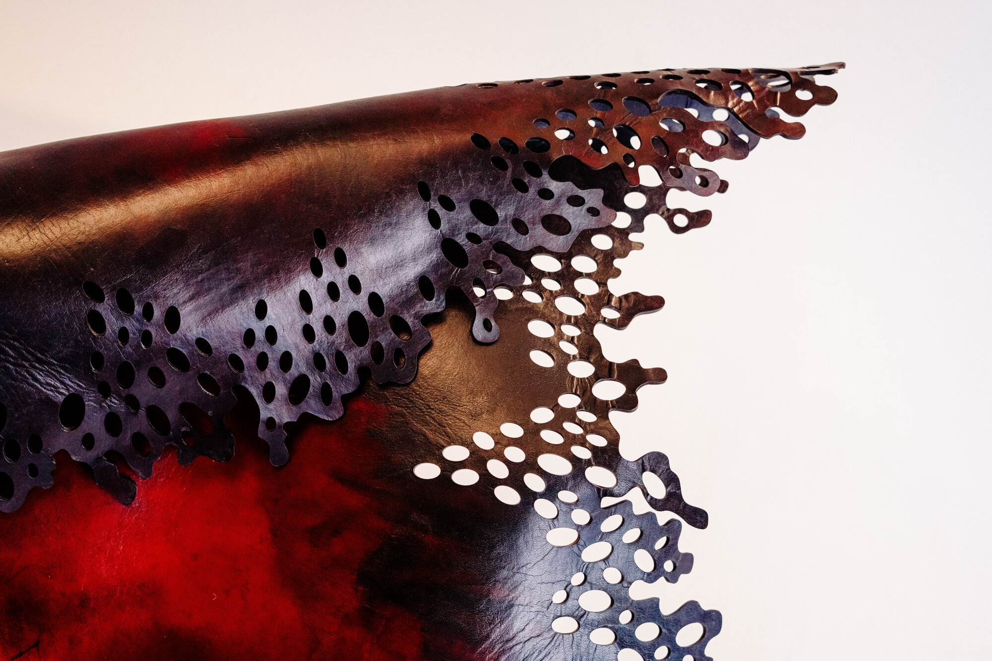 The sculptures materialise this inner alchemy. Leather here has been treated as a proxy for skin and memory, subjected to stretching, compression, burning, and imprinting until it carries the residue of impact. Each marked surface is intended to represent a diagram of forces that could be applied to any body, anywhere.